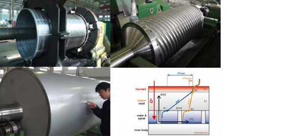 • 薄壁高效輥筒的輥面外殼厚度僅為標準輥筒外殼厚度的 50%-70%;內部減少螺棱支撐點的面積以增大冷卻水的接觸面積 和熱轉換效率。為抵消輥面較薄的強度減弱,采用了整體圓弧形流道 以增加承壓強度。相同的工況環境,使用薄壁高效輥筒的片材設備產 量增加了 20%-50%。