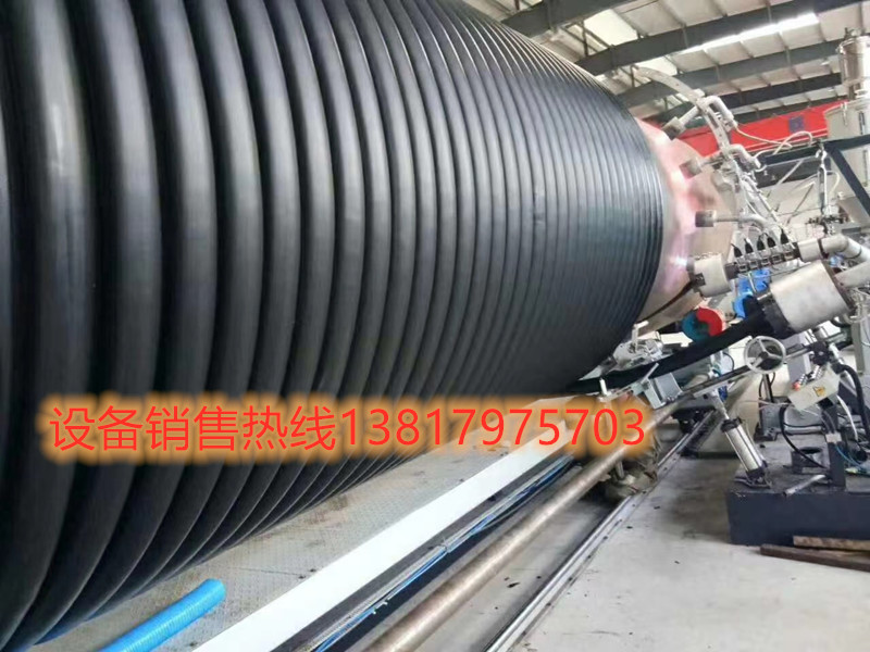 從擠塑機口模擠出的 190 ℃的平料帶和 O 型管料按預定的位置均勻地纏繞在加熱的鋼制輥筒模具上,自然冷卻后保證了管材熔接縫質(zhì)量。特別是結(jié)構(gòu)設計中平料帶的搭接縫被帶PP支撐管的O型管料所覆蓋,提高了管材搭接縫質(zhì)量及制品整體的抗外壓能力 。