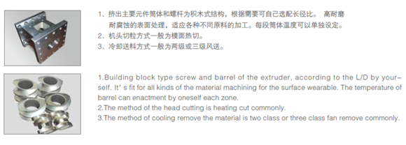 該機組是由平行雙螺桿擠出機與相應造粒輔機組成的成套設備,主要適用于PVC、PE類原料添加木粉或填充料的造粒。生產 的塑料顆粒均勻、密實、美觀,輔機采用風送集料,冷卻,具有自動化程度高,生產效率佳等特點。
