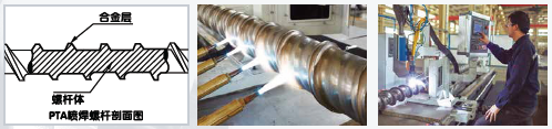 雙金屬螺桿也從以往的牙頂噴焊,更新設(shè)備而采用高壓快 速全面合金披覆的溶射技術(shù),耐腐蝕型合金適用于尼龍,