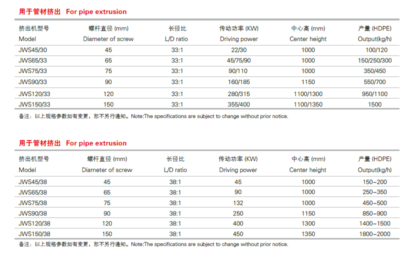 采用新型屏障式螺桿,實現高轉速,高擠出量,低能耗,并且在 低溫下能達到理想的混煉效果,嚴格控制剪切作用,以獲得理想 均勻的物料溫度,比免了大口徑的管材內壁產生漣漪紋的現象。